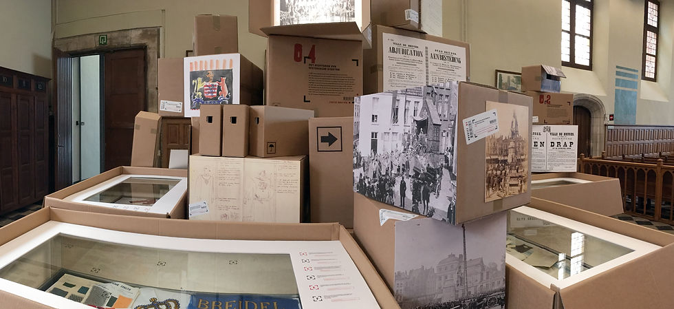 PK Projects tekent voor én bouwt een chaotische expo met kartonnen panelen en opbergdozen, in alle vormen en formaten. De typografie en vormgeving verwijzen naar de typische ‘klasseerstijl’. Met de promofilm ‘Stoffige Archieven’ wordt alles extra in de verf gezet.